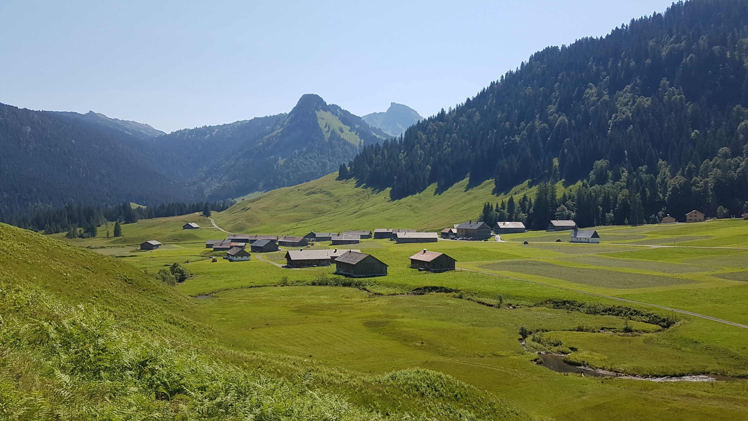 Etwa 1 Stunde mit dem Auto nach Schönenbach. Schönenbach gehört zu den schönsten Vorsäßsiedlungen Vorarlbergs. Die Wanderung führt zu Almisguntenalpe, welche abgeschieden in einem Kar unterhalb des Diedamskopfes liegt. Bei der neu erbauten Alphütte Stoggertenn erreicht man den höchsten Punkt der Wanderung. Entlang des Osterguntenbaches führt der Weg abwärts zurück zum Parkplatz.